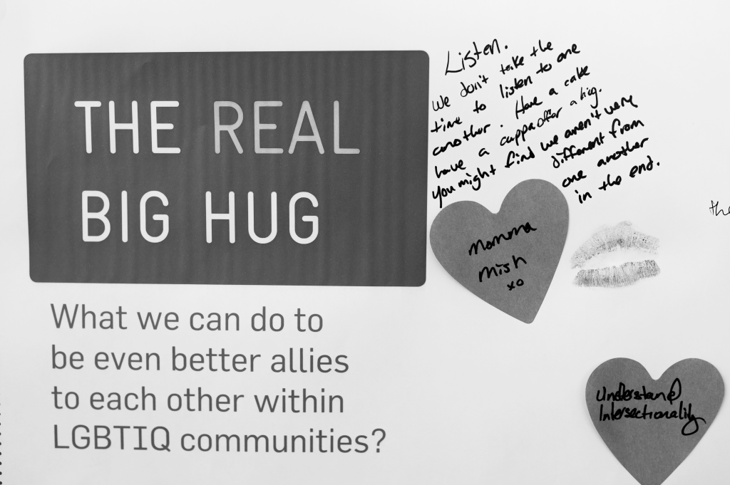 We asked participants to tell us what we can to to be even better allies to each other within LGBTIQ communities. The themes were analysed to produce a postcard and a brief community report – see link here: RealBigHugReport